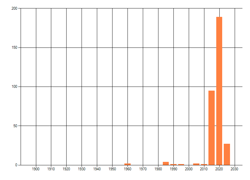 Het aantal atlasblokken (5x5 km) waarin de soort is gemeld binnen een periode van vijf jaar (vanaf 1980) of twintig jaar. Niet gecorrigeerd voor waarnemersinspanning en het aantal doorgegeven waarnemingen kan sterk variëren per periode, dus een trend in verspreiding kan hier niet direct uit worden afgelezen. Het opgegeven jaartal is het eerste jaar van de periode. Bron: gevalideerde waarnemingen uit de NDFF.
