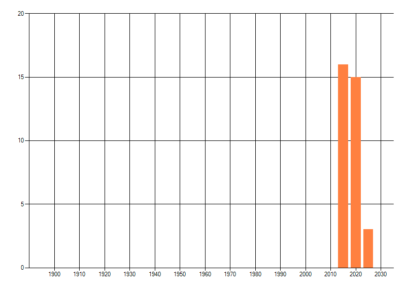 Het aantal atlasblokken (5x5 km) waarin de soort is gemeld binnen een periode van vijf jaar (vanaf 1980) of twintig jaar. Niet gecorrigeerd voor waarnemersinspanning en het aantal doorgegeven waarnemingen kan sterk variëren per periode, dus een trend in verspreiding kan hier niet direct uit worden afgelezen. Het opgegeven jaartal is het eerste jaar van de periode. Bron: gevalideerde waarnemingen uit de NDFF.