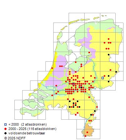 Het aantal atlasblokken (5x5 km) waarin de soort is gemeld binnen een periode van vijf jaar (vanaf 1980) of twintig jaar. Niet gecorrigeerd voor waarnemersinspanning en het aantal doorgegeven waarnemingen kan sterk variëren per periode, dus een trend in verspreiding kan hier niet direct uit worden afgelezen. Het opgegeven jaartal is het eerste jaar van de periode. Bron: gevalideerde waarnemingen uit de NDFF.