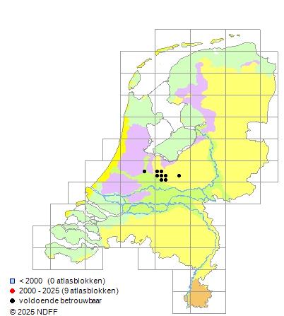 Het aantal atlasblokken (5x5 km) waarin de soort is gemeld binnen een periode van vijf jaar (vanaf 1980) of twintig jaar. Niet gecorrigeerd voor waarnemersinspanning en het aantal doorgegeven waarnemingen kan sterk variëren per periode, dus een trend in verspreiding kan hier niet direct uit worden afgelezen. Het opgegeven jaartal is het eerste jaar van de periode. Bron: gevalideerde waarnemingen uit de NDFF.