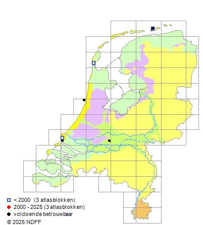 Het aantal atlasblokken (5x5 km) waarin de soort is gemeld binnen een periode van vijf jaar (vanaf 1980) of twintig jaar. Niet gecorrigeerd voor waarnemersinspanning en het aantal doorgegeven waarnemingen kan sterk variëren per periode, dus een trend in verspreiding kan hier niet direct uit worden afgelezen. Het opgegeven jaartal is het eerste jaar van de periode. Bron: gevalideerde waarnemingen uit de NDFF.