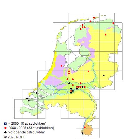 Het aantal atlasblokken (5x5 km) waarin de soort is gemeld binnen een periode van vijf jaar (vanaf 1980) of twintig jaar. Niet gecorrigeerd voor waarnemersinspanning en het aantal doorgegeven waarnemingen kan sterk variëren per periode, dus een trend in verspreiding kan hier niet direct uit worden afgelezen. Het opgegeven jaartal is het eerste jaar van de periode. Bron: gevalideerde waarnemingen uit de NDFF.