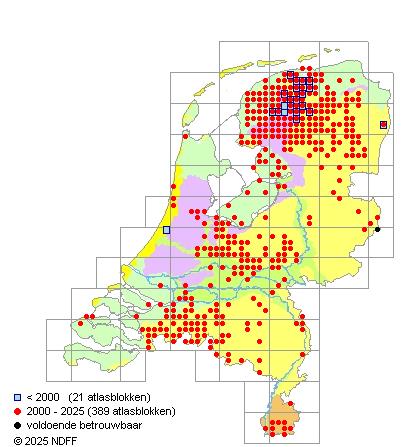 Het aantal atlasblokken (5x5 km) waarin de soort is gemeld binnen een periode van vijf jaar (vanaf 1980) of twintig jaar. Niet gecorrigeerd voor waarnemersinspanning en het aantal doorgegeven waarnemingen kan sterk variëren per periode, dus een trend in verspreiding kan hier niet direct uit worden afgelezen. Het opgegeven jaartal is het eerste jaar van de periode. Bron: gevalideerde waarnemingen uit de NDFF.
