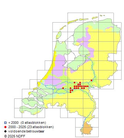 Het aantal atlasblokken (5x5 km) waarin de soort is gemeld binnen een periode van vijf jaar (vanaf 1980) of twintig jaar. Niet gecorrigeerd voor waarnemersinspanning en het aantal doorgegeven waarnemingen kan sterk variëren per periode, dus een trend in verspreiding kan hier niet direct uit worden afgelezen. Het opgegeven jaartal is het eerste jaar van de periode. Bron: gevalideerde waarnemingen uit de NDFF.