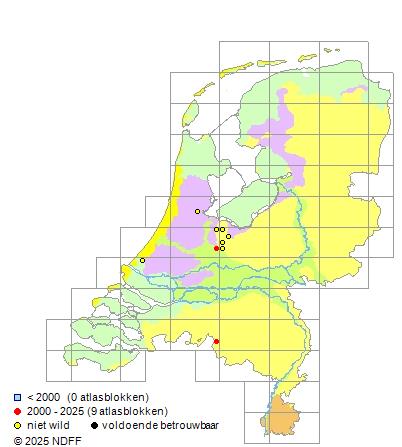 Het aantal atlasblokken (5x5 km) waarin de soort is gemeld binnen een periode van vijf jaar (vanaf 1980) of twintig jaar. Niet gecorrigeerd voor waarnemersinspanning en het aantal doorgegeven waarnemingen kan sterk variëren per periode, dus een trend in verspreiding kan hier niet direct uit worden afgelezen. Het opgegeven jaartal is het eerste jaar van de periode. Bron: gevalideerde waarnemingen uit de NDFF.