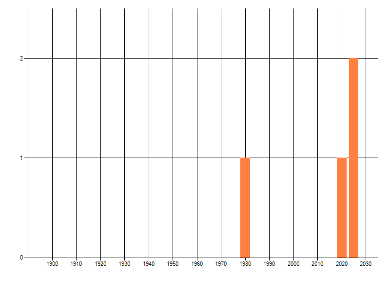 Het aantal atlasblokken (5x5 km) waarin de soort is gemeld binnen een periode van vijf jaar (vanaf 1980) of twintig jaar. Niet gecorrigeerd voor waarnemersinspanning en het aantal doorgegeven waarnemingen kan sterk variëren per periode, dus een trend in verspreiding kan hier niet direct uit worden afgelezen. Het opgegeven jaartal is het eerste jaar van de periode. Bron: gevalideerde waarnemingen uit de NDFF.