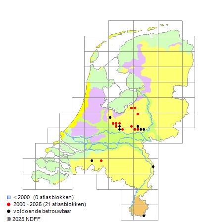 Het aantal atlasblokken (5x5 km) waarin de soort is gemeld binnen een periode van vijf jaar (vanaf 1980) of twintig jaar. Niet gecorrigeerd voor waarnemersinspanning en het aantal doorgegeven waarnemingen kan sterk variëren per periode, dus een trend in verspreiding kan hier niet direct uit worden afgelezen. Het opgegeven jaartal is het eerste jaar van de periode. Bron: gevalideerde waarnemingen uit de NDFF.