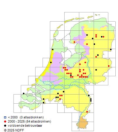 Het aantal atlasblokken (5x5 km) waarin de soort is gemeld binnen een periode van vijf jaar (vanaf 1980) of twintig jaar. Niet gecorrigeerd voor waarnemersinspanning en het aantal doorgegeven waarnemingen kan sterk variëren per periode, dus een trend in verspreiding kan hier niet direct uit worden afgelezen. Het opgegeven jaartal is het eerste jaar van de periode. Bron: gevalideerde waarnemingen uit de NDFF.