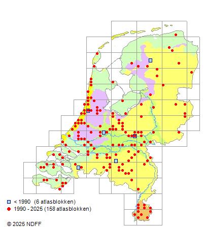 Het aantal atlasblokken (5x5 km) waarin de soort is gemeld binnen een periode van vijf jaar (vanaf 1980) of twintig jaar. Niet gecorrigeerd voor waarnemersinspanning en het aantal doorgegeven waarnemingen kan sterk variëren per periode, dus een trend in verspreiding kan hier niet direct uit worden afgelezen. Het opgegeven jaartal is het eerste jaar van de periode. Bron: gevalideerde waarnemingen uit de NDFF.