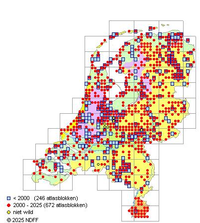Het aantal atlasblokken (5x5 km) waarin de soort is gemeld binnen een periode van vijf jaar (vanaf 1980) of twintig jaar. Niet gecorrigeerd voor waarnemersinspanning en het aantal doorgegeven waarnemingen kan sterk variëren per periode, dus een trend in verspreiding kan hier niet direct uit worden afgelezen. Het opgegeven jaartal is het eerste jaar van de periode. Bron: gevalideerde waarnemingen uit de NDFF.