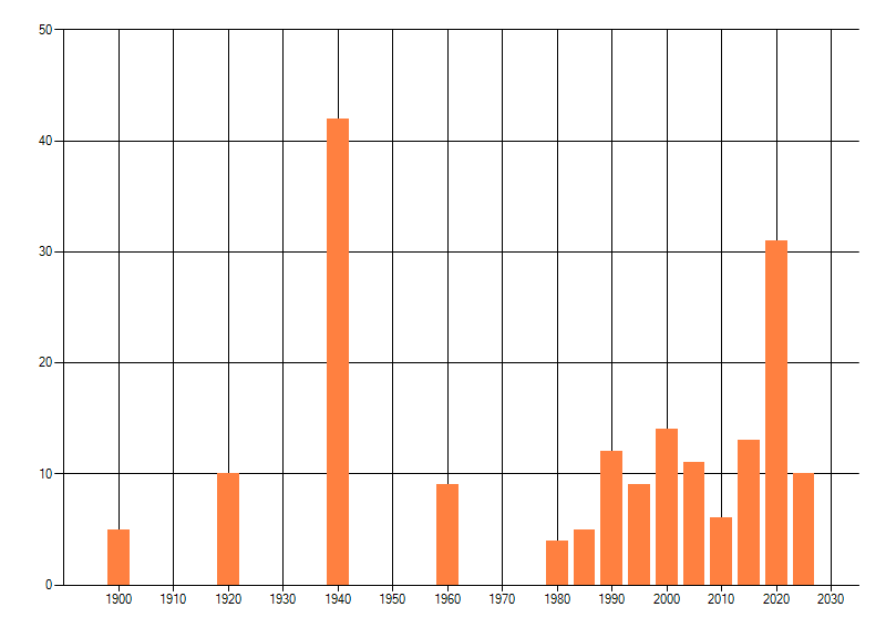 Het aantal atlasblokken (5x5 km) waarin de soort is gemeld binnen een periode van vijf jaar (vanaf 1980) of twintig jaar. Niet gecorrigeerd voor waarnemersinspanning en het aantal doorgegeven waarnemingen kan sterk variƫren per periode, dus een trend in verspreiding kan hier niet direct uit worden afgelezen. Het opgegeven jaartal is het eerste jaar van de periode. Bron: gevalideerde waarnemingen uit de NDFF.