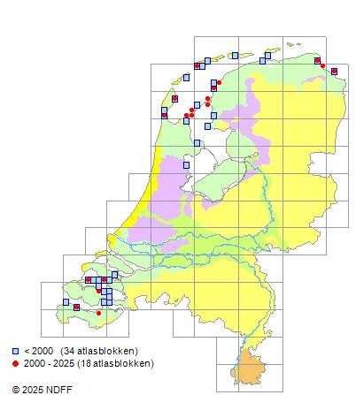 Het aantal atlasblokken (5x5 km) waarin de soort is gemeld binnen een periode van vijf jaar (vanaf 1980) of twintig jaar. Niet gecorrigeerd voor waarnemersinspanning en het aantal doorgegeven waarnemingen kan sterk variëren per periode, dus een trend in verspreiding kan hier niet direct uit worden afgelezen. Het opgegeven jaartal is het eerste jaar van de periode. Bron: gevalideerde waarnemingen uit de NDFF.
