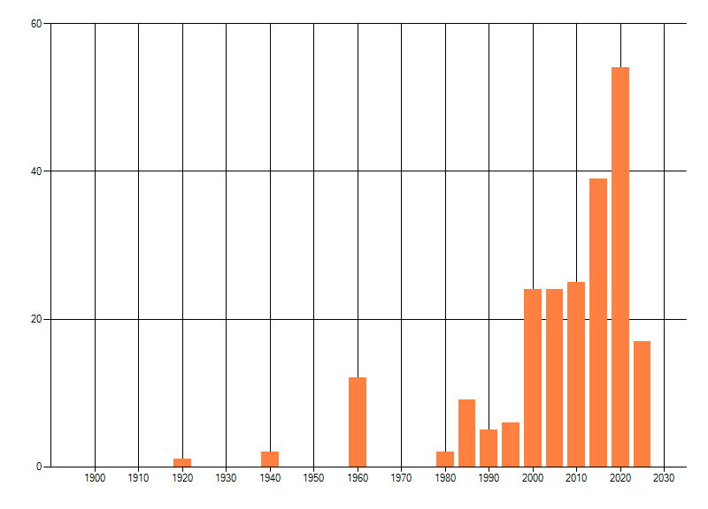 Het aantal atlasblokken (5x5 km) waarin de soort is gemeld binnen een periode van vijf jaar (vanaf 1980) of twintig jaar. Niet gecorrigeerd voor waarnemersinspanning en het aantal doorgegeven waarnemingen kan sterk variëren per periode, dus een trend in verspreiding kan hier niet direct uit worden afgelezen. Het opgegeven jaartal is het eerste jaar van de periode. Bron: gevalideerde waarnemingen uit de NDFF.