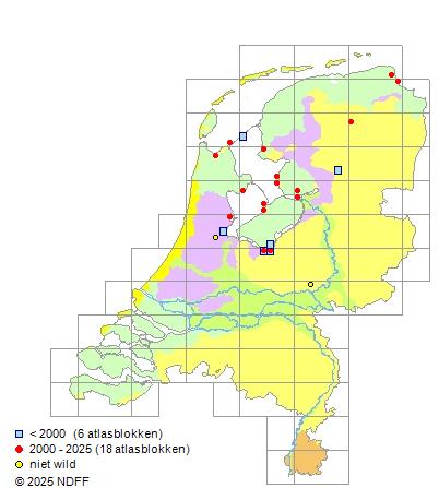 Het aantal atlasblokken (5x5 km) waarin de soort is gemeld binnen een periode van vijf jaar (vanaf 1980) of twintig jaar. Niet gecorrigeerd voor waarnemersinspanning en het aantal doorgegeven waarnemingen kan sterk variëren per periode, dus een trend in verspreiding kan hier niet direct uit worden afgelezen. Het opgegeven jaartal is het eerste jaar van de periode. Bron: gevalideerde waarnemingen uit de NDFF.