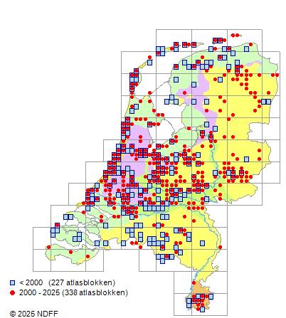 Het aantal atlasblokken (5x5 km) waarin de soort is gemeld binnen een periode van vijf jaar (vanaf 1980) of twintig jaar. Niet gecorrigeerd voor waarnemersinspanning en het aantal doorgegeven waarnemingen kan sterk variëren per periode, dus een trend in verspreiding kan hier niet direct uit worden afgelezen. Het opgegeven jaartal is het eerste jaar van de periode. Bron: gevalideerde waarnemingen uit de NDFF.
