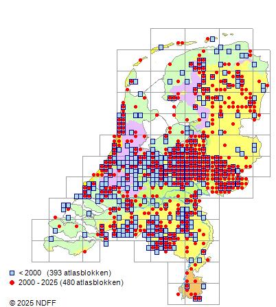 Het aantal atlasblokken (5x5 km) waarin de soort is gemeld binnen een periode van vijf jaar (vanaf 1980) of twintig jaar.
