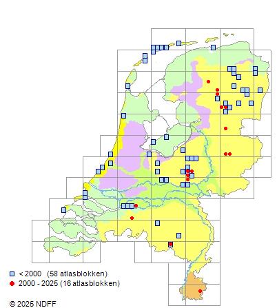 Het aantal atlasblokken (5x5 km) waarin de soort is gemeld binnen een periode van vijf jaar (vanaf 1980) of twintig jaar. Niet gecorrigeerd voor waarnemersinspanning en het aantal doorgegeven waarnemingen kan sterk variëren per periode, dus een trend in verspreiding kan hier niet direct uit worden afgelezen. Het opgegeven jaartal is het eerste jaar van de periode. Bron: gevalideerde waarnemingen uit de NDFF.