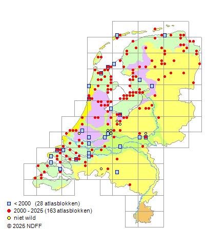 Het aantal atlasblokken (5x5 km) waarin de soort is gemeld binnen een periode van vijf jaar (vanaf 1980) of twintig jaar. Niet gecorrigeerd voor waarnemersinspanning en het aantal doorgegeven waarnemingen kan sterk variëren per periode, dus een trend in verspreiding kan hier niet direct uit worden afgelezen. Het opgegeven jaartal is het eerste jaar van de periode. Bron: gevalideerde waarnemingen uit de NDFF.