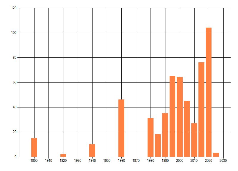 Het aantal atlasblokken (5x5 km) waarin de soort is gemeld binnen een periode van vijf jaar (vanaf 1980) of twintig jaar. Niet gecorrigeerd voor waarnemersinspanning en het aantal doorgegeven waarnemingen kan sterk variƫren per periode, dus een trend in verspreiding kan hier niet direct uit worden afgelezen. Het opgegeven jaartal is het eerste jaar van de periode. Bron: gevalideerde waarnemingen uit de NDFF.