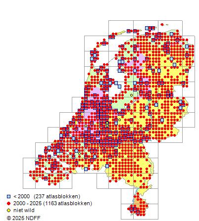 Het aantal atlasblokken (5x5 km) waarin de soort is gemeld binnen een periode van vijf jaar (vanaf 1980) of twintig jaar. Niet gecorrigeerd voor waarnemersinspanning en het aantal doorgegeven waarnemingen kan sterk variëren per periode, dus een trend in verspreiding kan hier niet direct uit worden afgelezen. Het opgegeven jaartal is het eerste jaar van de periode. Bron: gevalideerde waarnemingen uit de NDFF.