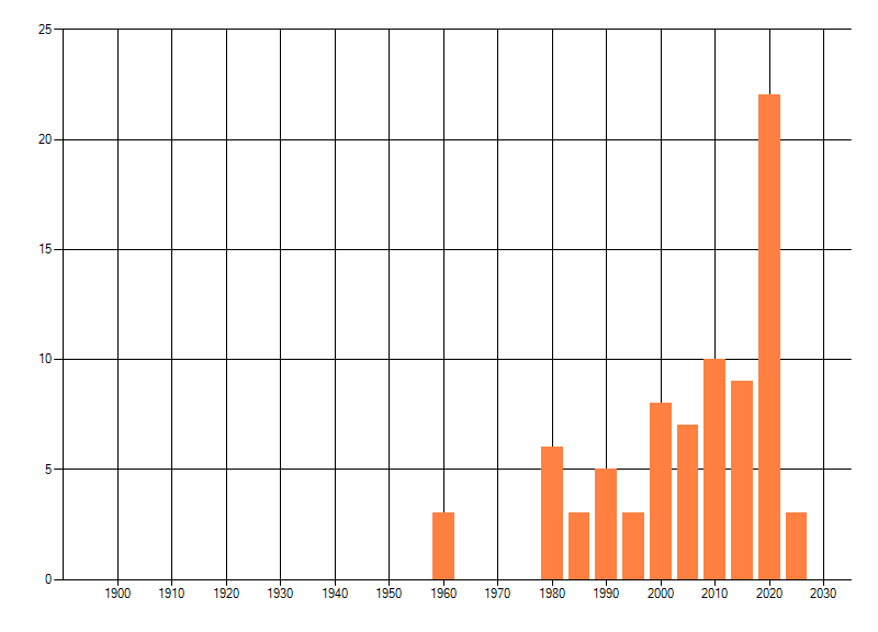 Het aantal atlasblokken (5x5 km) waarin de soort is gemeld binnen een periode van vijf jaar (vanaf 1980) of twintig jaar. Niet gecorrigeerd voor waarnemersinspanning en het aantal doorgegeven waarnemingen kan sterk variëren per periode, dus een trend in verspreiding kan hier niet direct uit worden afgelezen. Het opgegeven jaartal is het eerste jaar van de periode. Bron: gevalideerde waarnemingen uit de NDFF.