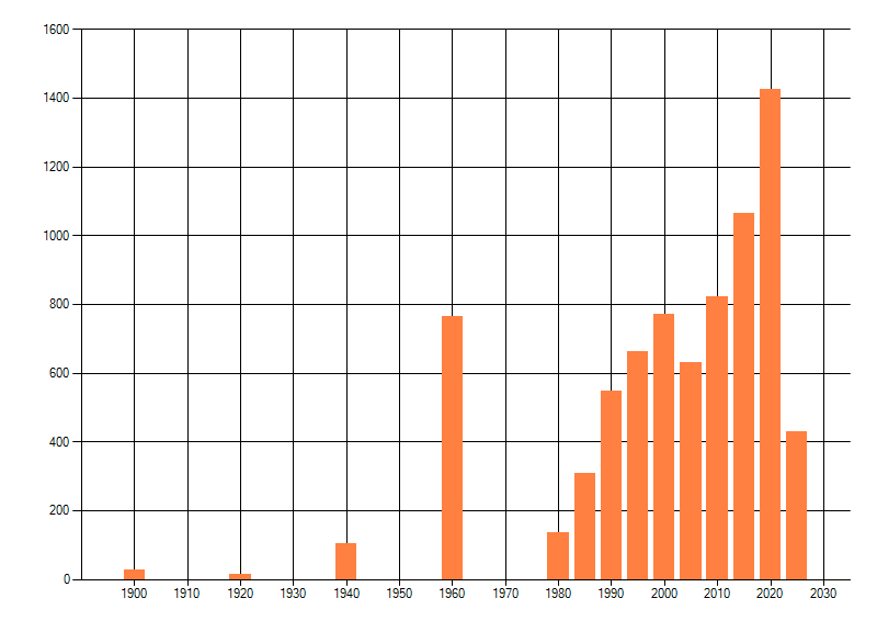 Het aantal atlasblokken (5x5 km) waarin de soort is gemeld binnen een periode van vijf jaar (vanaf 1980) of twintig jaar. Niet gecorrigeerd voor waarnemersinspanning en het aantal doorgegeven waarnemingen kan sterk variƫren per periode, dus een trend in verspreiding kan hier niet direct uit worden afgelezen. Het opgegeven jaartal is het eerste jaar van de periode. Bron: gevalideerde waarnemingen uit de NDFF.