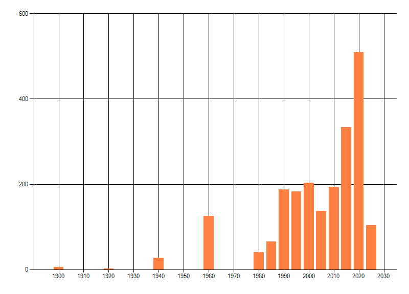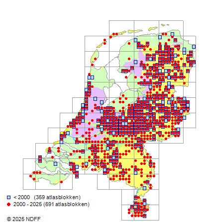 Het aantal atlasblokken (5x5 km) waarin de soort is gemeld binnen een periode van vijf jaar (vanaf 1980) of twintig jaar. Niet gecorrigeerd voor waarnemersinspanning en het aantal doorgegeven waarnemingen kan sterk variëren per periode, dus een trend in verspreiding kan hier niet direct uit worden afgelezen. Het opgegeven jaartal is het eerste jaar van de periode. Bron: gevalideerde waarnemingen uit de NDFF.