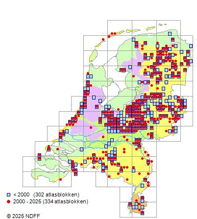 Het aantal atlasblokken (5x5 km) waarin de soort is gemeld binnen een periode van vijf jaar (vanaf 1980) of twintig jaar. Niet gecorrigeerd voor waarnemersinspanning en het aantal doorgegeven waarnemingen kan sterk variëren per periode, dus een trend in verspreiding kan hier niet direct uit worden afgelezen. Het opgegeven jaartal is het eerste jaar van de periode. Bron: gevalideerde waarnemingen uit de NDFF.