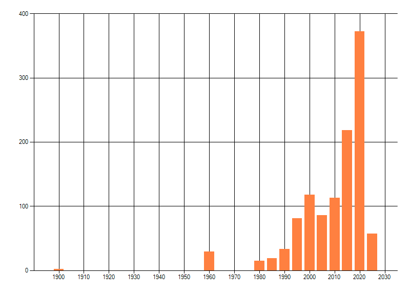 Het aantal atlasblokken (5x5 km) waarin de soort is gemeld binnen een periode van vijf jaar (vanaf 1980) of twintig jaar. Niet gecorrigeerd voor waarnemersinspanning en het aantal doorgegeven waarnemingen kan sterk variëren per periode, dus een trend in verspreiding kan hier niet direct uit worden afgelezen. Het opgegeven jaartal is het eerste jaar van de periode. Bron: gevalideerde waarnemingen uit de NDFF.