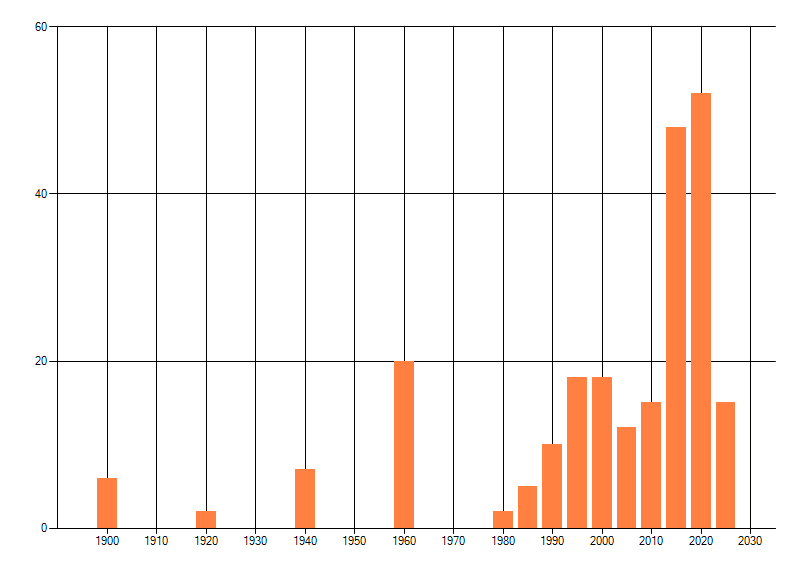 Het aantal atlasblokken (5x5 km) waarin de soort is gemeld binnen een periode van vijf jaar (vanaf 1980) of twintig jaar. Niet gecorrigeerd voor waarnemersinspanning en het aantal doorgegeven waarnemingen kan sterk variëren per periode, dus een trend in verspreiding kan hier niet direct uit worden afgelezen. Het opgegeven jaartal is het eerste jaar van de periode. Bron: gevalideerde waarnemingen uit de NDFF.
