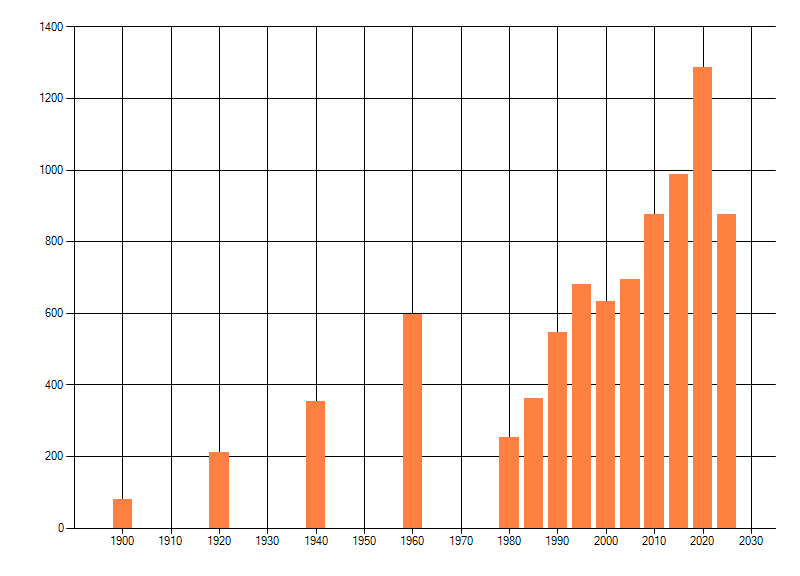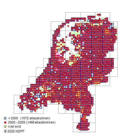 Het aantal atlasblokken (5x5 km) waarin de soort is gemeld binnen een periode van vijf jaar (vanaf 1980) of twintig jaar. Niet gecorrigeerd voor waarnemersinspanning en het aantal doorgegeven waarnemingen kan sterk variëren per periode, dus een trend in verspreiding kan hier niet direct uit worden afgelezen. Het opgegeven jaartal is het eerste jaar van de periode. Bron: gevalideerde waarnemingen uit de NDFF.