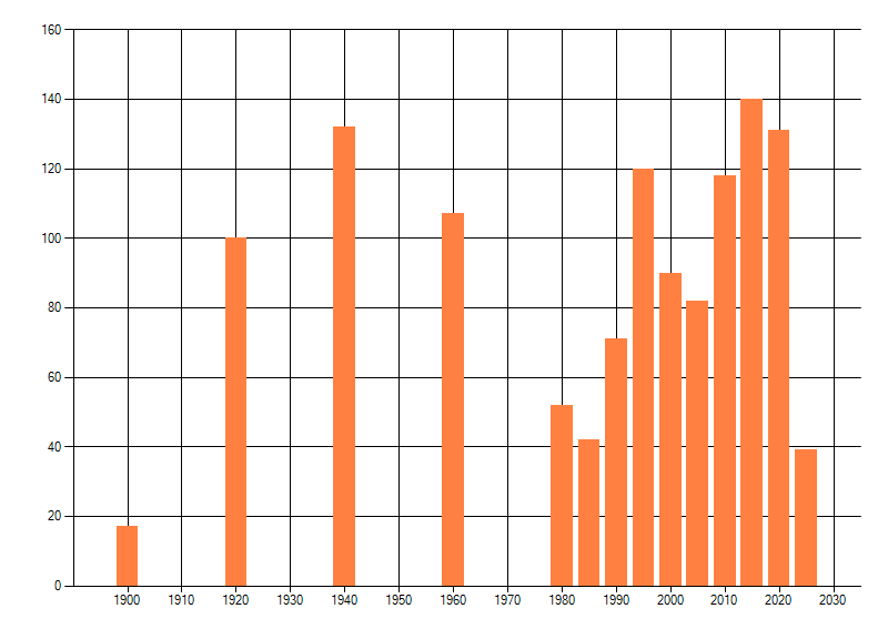 Het aantal atlasblokken (5x5 km) waarin de soort is gemeld binnen een periode van vijf jaar (vanaf 1980) of twintig jaar. Niet gecorrigeerd voor waarnemersinspanning en het aantal doorgegeven waarnemingen kan sterk variëren per periode, dus een trend in verspreiding kan hier niet direct uit worden afgelezen. Het opgegeven jaartal is het eerste jaar van de periode. Bron: gevalideerde waarnemingen uit de NDFF.