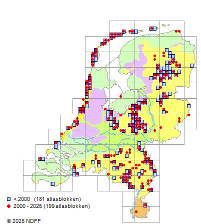 Het aantal atlasblokken (5x5 km) waarin de soort is gemeld binnen een periode van vijf jaar (vanaf 1980) of twintig jaar.