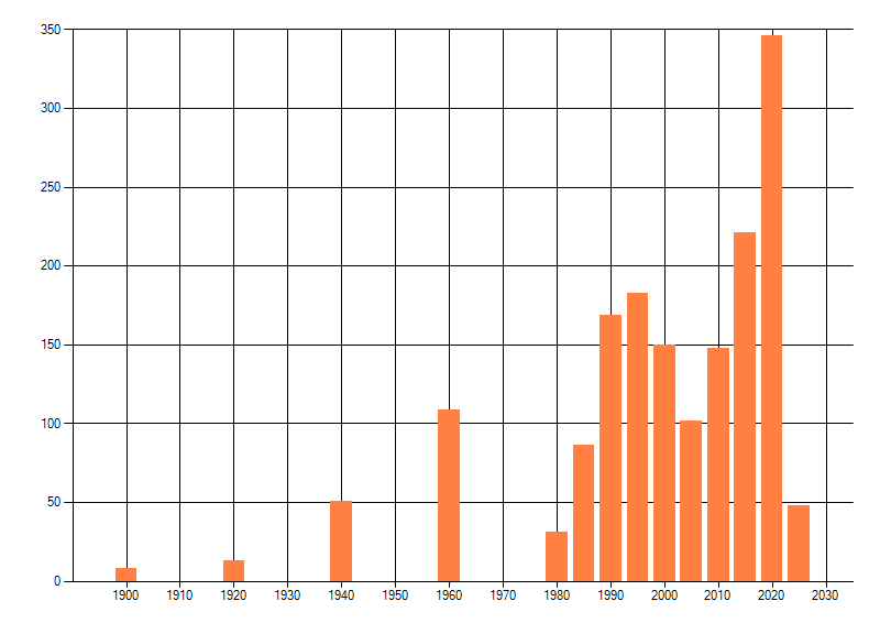Het aantal atlasblokken (5x5 km) waarin de soort is gemeld binnen een periode van vijf jaar (vanaf 1980) of twintig jaar. Niet gecorrigeerd voor waarnemersinspanning en het aantal doorgegeven waarnemingen kan sterk variëren per periode, dus een trend in verspreiding kan hier niet direct uit worden afgelezen. Het opgegeven jaartal is het eerste jaar van de periode. Bron: gevalideerde waarnemingen uit de NDFF.