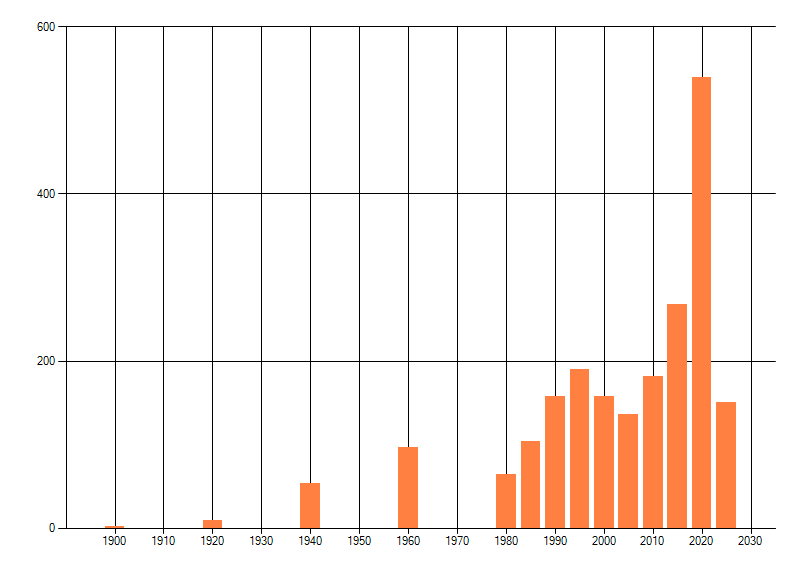Het aantal atlasblokken (5x5 km) waarin de soort is gemeld binnen een periode van vijf jaar (vanaf 1980) of twintig jaar. Niet gecorrigeerd voor waarnemersinspanning en het aantal doorgegeven waarnemingen kan sterk variëren per periode, dus een trend in verspreiding kan hier niet direct uit worden afgelezen. Het opgegeven jaartal is het eerste jaar van de periode. Bron: gevalideerde waarnemingen uit de NDFF.