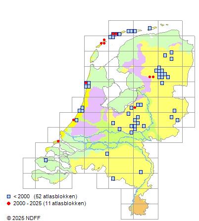download in hoge resolutieHet geschatte aantal atlasblokken (5x5 km) waarin de soort voorkomt per periode van vijf jaar. Bron: A. Aptroot et al. Basisrapport Rode Lijst Korstmossen 2011 © BLWG 2012.
