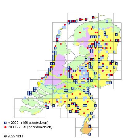 Het aantal atlasblokken (5x5 km) waarin de soort is gemeld binnen een periode van vijf jaar (vanaf 1980) of twintig jaar. Niet gecorrigeerd voor waarnemersinspanning en het aantal doorgegeven waarnemingen kan sterk variëren per periode, dus een trend in verspreiding kan hier niet direct uit worden afgelezen. Het opgegeven jaartal is het eerste jaar van de periode. Bron: gevalideerde waarnemingen uit de NDFF.