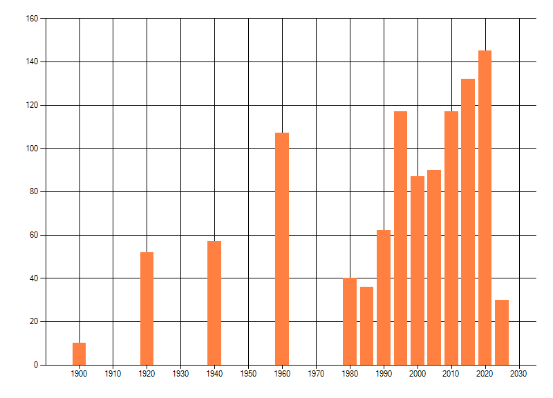 Het aantal atlasblokken (5x5 km) waarin de soort is gemeld binnen een periode van vijf jaar (vanaf 1980) of twintig jaar. Niet gecorrigeerd voor waarnemersinspanning en het aantal doorgegeven waarnemingen kan sterk variƫren per periode, dus een trend in verspreiding kan hier niet direct uit worden afgelezen. Het opgegeven jaartal is het eerste jaar van de periode. Bron: gevalideerde waarnemingen uit de NDFF.