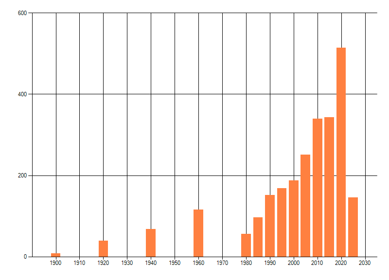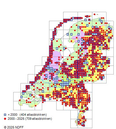 Het aantal atlasblokken (5x5 km) waarin de soort is gemeld binnen een periode van vijf jaar (vanaf 1980) of twintig jaar. Niet gecorrigeerd voor waarnemersinspanning en het aantal doorgegeven waarnemingen kan sterk variëren per periode, dus een trend in verspreiding kan hier niet direct uit worden afgelezen. Het opgegeven jaartal is het eerste jaar van de periode. Bron: gevalideerde waarnemingen uit de NDFF.