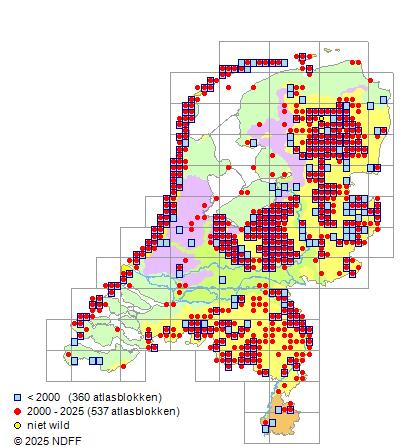 Het aantal atlasblokken (5x5 km) waarin de soort is gemeld binnen een periode van vijf jaar (vanaf 1980) of twintig jaar.