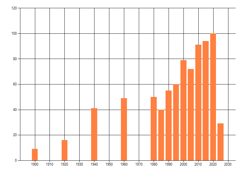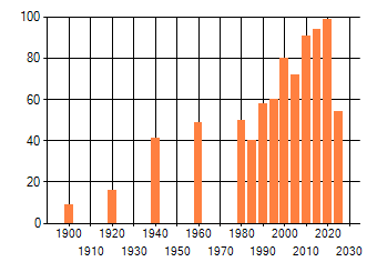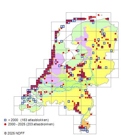 Het aantal atlasblokken (5x5 km) waarin de soort is gemeld binnen een periode van vijf jaar (vanaf 1980) of twintig jaar. Niet gecorrigeerd voor waarnemersinspanning en het aantal doorgegeven waarnemingen kan sterk variƫren per periode, dus een trend in verspreiding kan hier niet direct uit worden afgelezen. Het opgegeven jaartal is het eerste jaar van de periode. Bron: gevalideerde waarnemingen uit de NDFF.