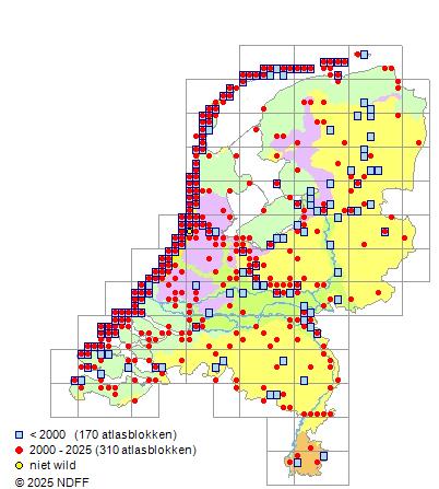 Het geschatte aantal atlasblokken (5x5 km) waarin de soort voorkomt per periode van vijf jaar. Bron: A. Aptroot et al. Basisrapport Rode Lijst Korstmossen 2011 © BLWG 2012.