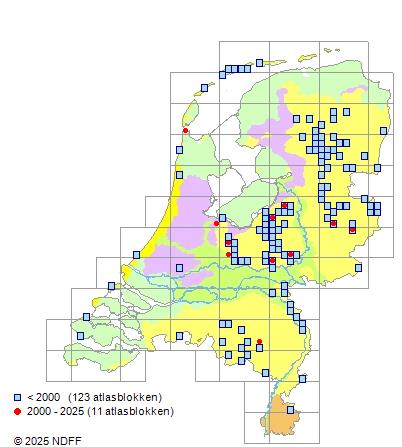 download in hoge resolutieHet geschatte aantal atlasblokken (5x5 km) waarin de soort voorkomt per periode van vijf jaar. Bron: A. Aptroot et al. Basisrapport Rode Lijst Korstmossen 2011 © BLWG 2012.