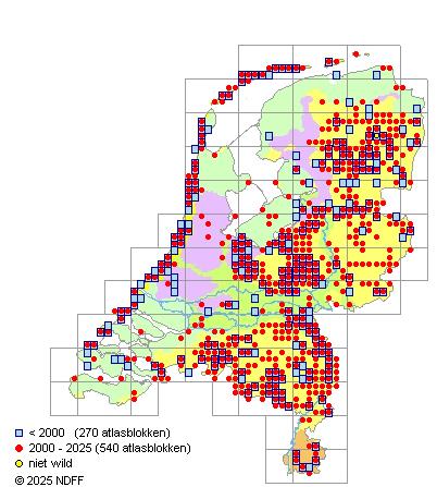 Het aantal atlasblokken (5x5 km) waarin de soort is gemeld binnen een periode van vijf jaar (vanaf 1980) of twintig jaar.
