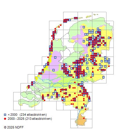 Het aantal atlasblokken (5x5 km) waarin de soort is gemeld binnen een periode van vijf jaar (vanaf 1980) of twintig jaar. Niet gecorrigeerd voor waarnemersinspanning en het aantal doorgegeven waarnemingen kan sterk variëren per periode, dus een trend in verspreiding kan hier niet direct uit worden afgelezen. Het opgegeven jaartal is het eerste jaar van de periode. Bron: gevalideerde waarnemingen uit de NDFF.