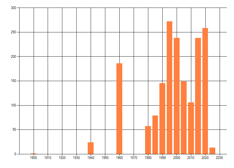 Het aantal atlasblokken (5x5 km) waarin de soort is gemeld binnen een periode van vijf jaar (vanaf 1980) of twintig jaar. Niet gecorrigeerd voor waarnemersinspanning en het aantal doorgegeven waarnemingen kan sterk variëren per periode, dus een trend in verspreiding kan hier niet direct uit worden afgelezen. Het opgegeven jaartal is het eerste jaar van de periode. Bron: gevalideerde waarnemingen uit de NDFF.