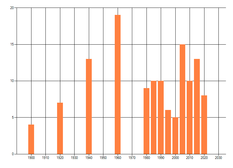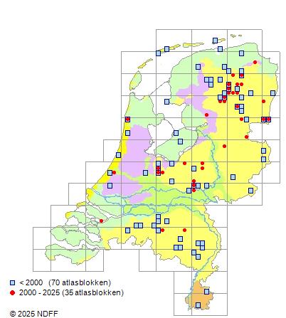 Het aantal atlasblokken (5x5 km) waarin de soort is gemeld binnen een periode van vijf jaar (vanaf 1980) of twintig jaar. Niet gecorrigeerd voor waarnemersinspanning en het aantal doorgegeven waarnemingen kan sterk variëren per periode, dus een trend in verspreiding kan hier niet direct uit worden afgelezen. Het opgegeven jaartal is het eerste jaar van de periode. Bron: gevalideerde waarnemingen uit de NDFF.