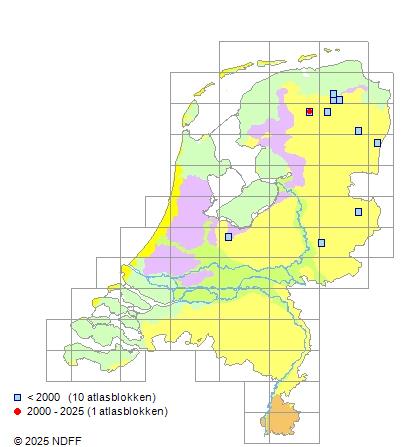 Het geschatte aantal atlasblokken (5x5 km) waarin de soort voorkomt per periode van vijf jaar. Bron: A. Aptroot et al. Basisrapport Rode Lijst Korstmossen 2011 © BLWG 2012.