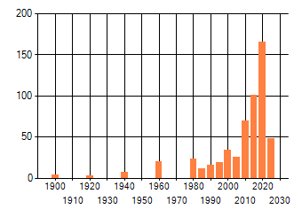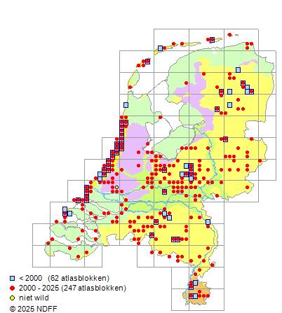 Het aantal atlasblokken (5x5 km) waarin de soort is gemeld binnen een periode van vijf jaar (vanaf 1980) of twintig jaar. Niet gecorrigeerd voor waarnemersinspanning en het aantal doorgegeven waarnemingen kan sterk variëren per periode, dus een trend in verspreiding kan hier niet direct uit worden afgelezen. Het opgegeven jaartal is het eerste jaar van de periode. Bron: gevalideerde waarnemingen uit de NDFF.