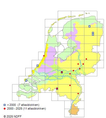 Het aantal atlasblokken (5x5 km) waarin de soort is gemeld binnen een periode van vijf jaar (vanaf 1980) of twintig jaar. Niet gecorrigeerd voor waarnemersinspanning en het aantal doorgegeven waarnemingen kan sterk variëren per periode, dus een trend in verspreiding kan hier niet direct uit worden afgelezen. Het opgegeven jaartal is het eerste jaar van de periode. Bron: gevalideerde waarnemingen uit de NDFF.